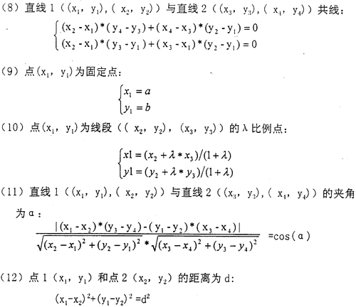 基于變量幾何法的參數(shù)設(shè)計中,約束描述方法是將其表示為代數(shù)方程組。對圖形實體的所有幾何或尺寸約束都可以表示為方程,方程中的變量是坐標點的分量。這些點一般稱為特征點。在二維圖形中,每個特征點有二個自由度,即(x,y)坐標值。用N個特征點定義的圖形共有2N個自由度。相應需要建立2N個獨立約束的方程組才能唯一確定圖形的形狀和位置。