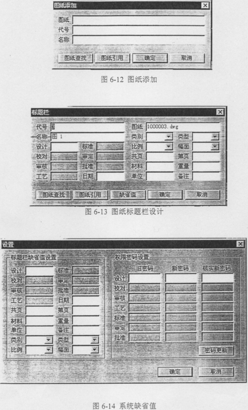 根據(jù)相應(yīng)項(xiàng)的密碼輸入,再選擇/添加/刪除產(chǎn)品,見圖6-10,進(jìn)行圖紙管理系統(tǒng)的主畫面(見圖6-11),進(jìn)而對(duì)產(chǎn)品選擇、圖紙進(jìn)行添加、刪除(圖6-12)及其編輯,明細(xì)表、標(biāo)題欄的設(shè)計(jì)(圖6-13)以及一些系統(tǒng)缺省值(圖6-14)的固定等等;