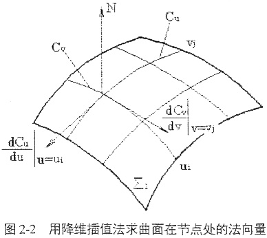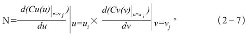 根據(jù)給定的已知曲面上的節(jié)點(diǎn)坐標(biāo)值,分別沿u=ui,v=vj構(gòu)造關(guān)于幾何參數(shù)u,v的三次樣條插函數(shù):,則曲面在點(diǎn)(ui,vj)處的法向量為
