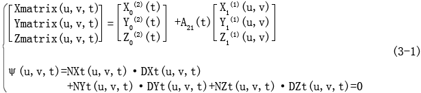 式(3-1)中第一式表示曲面Σ1由坐標(biāo)系S1變換到坐標(biāo)系S2所形成的曲面族,Xmatrix,Ymatrix,Zmatrix分別表示曲面族中各點(diǎn)在x,y,z坐標(biāo)方向上的坐標(biāo)值;第二式中的,NXt,NYt,NZt表示曲面Σ1在點(diǎn)(u,v)對應(yīng)于t的相對法矢分量,DXt,DYt,DZt表示點(diǎn)(u,v)運(yùn)動軌跡對應(yīng)于t的相對切矢分量。