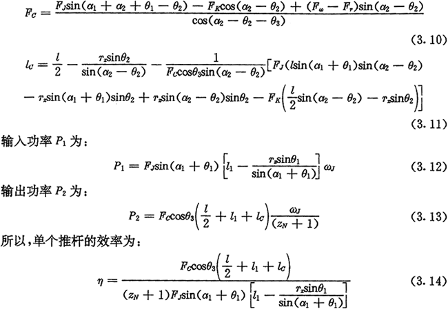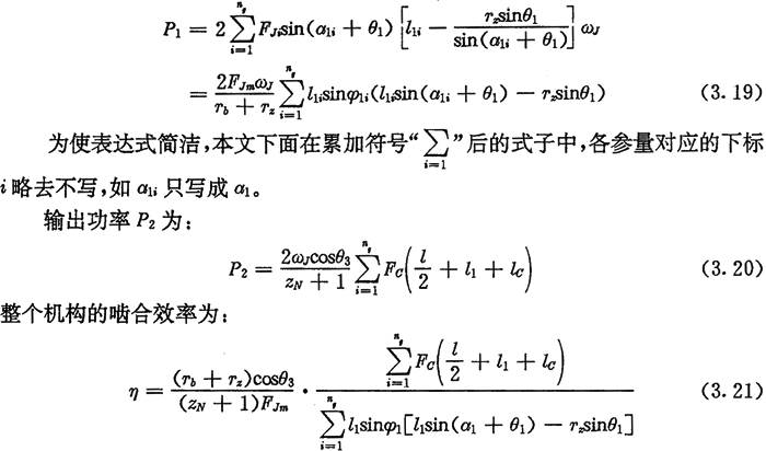 計算時,先根據輸入功率P1及轉速ωJ由(3.19)式計算出FJm,然后對每一工作推桿由式(3.17)計算出FJi,由式(3.10)式及式(3.11)計算出Fci及l(fā)ci,最后代入式(3.21)計算出效率η。