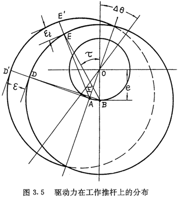 設傳動構件之間無間隙,并設激波器是完全剛性的。在驅動力矩作用下,各工作推桿的內滾子在與激波器接觸處產生法向彈性變形,使激波器轉過一個微小的角度△θ,如圖3.5所示,則可確定彈性變形量εi的分布規(guī)律。