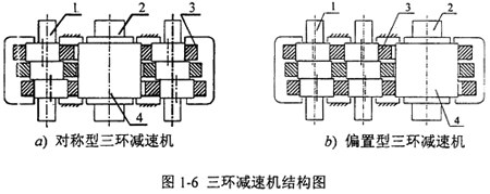 由于三環(huán)減速機的研究歷史較短,作為一種新生事物,它的發(fā)展道路也必定是曲折的。我國生產的三環(huán)減速機的結構如圖1-6所示,a)是對稱型三環(huán)減速機,b)是偏置型三環(huán)減速機,三環(huán)減速機由兩根高速偏心輸入軸1,低速輸出軸2,三片為齒環(huán)板3和外齒輪4構成。三片內齒環(huán)板3偏心安裝在兩根高速軸1上,它們都與外齒輪4相嚙合,外齒輪4安裝在輸出軸上,各軸均平行配置,利用三相并列平行雙曲柄機構來克服死點。雙曲柄機構的最大缺點就是存在死點位置,即當曲柄與連桿共線時,機構處于運動不確定位置,此時傳動角為零,機構無法運動,因此必須采取雙曲柄軸動力輸入、多相并列雙曲柄機構和多曲柄機構來克服死點。