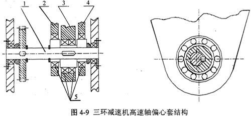 在三環(huán)減速機(jī)中,高速輸入軸上要加工三對(duì)偏心軸頸,依次安裝三個(gè)環(huán)板。由于中間一塊環(huán)板的安裝比較困難,一般采用圖4-9所示的偏心套結(jié)構(gòu),高速軸1與偏心套2、3、4之間通過(guò)平鍵聯(lián)接,軸與偏心套之間為過(guò)渡配合H7/k6,而偏心套通過(guò)環(huán)板軸承5與環(huán)板相聯(lián)。