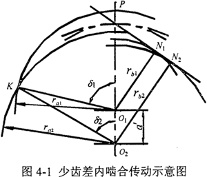 少斷差內(nèi)嚙合傳動(dòng)是指內(nèi)、外齒輪的齒數(shù)差較少的一種行星傳動(dòng)形式,它具有傳動(dòng)比大、體積小、重量輕、加工方便等優(yōu)點(diǎn),日益廣泛地應(yīng)用于國(guó)防、礦山、冶金、化工、紡織、起重運(yùn)輸、建筑工程、食品工業(yè)和儀表制造等部門和行業(yè)中。少齒差內(nèi)嚙合傳動(dòng)示意圖如圖4-1所示。