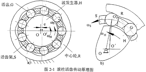 滾柱活齒傳動(dòng)系統(tǒng)(見圖2-la)主要由波發(fā)生器H、活齒G、活齒架S、中心輪R四個(gè)部分組成。如圖2-lb所示,滾柱活齒傳動(dòng)系統(tǒng)在工作時(shí),輸入驅(qū)動(dòng)力后,輸入軸以等角速度ωH,逆時(shí)針旋轉(zhuǎn),從而帶動(dòng)波發(fā)生器使其幾何中心O′繞旋轉(zhuǎn)中心O以同樣角速度旋轉(zhuǎn),波發(fā)生器半徑變化的輪廓曲線產(chǎn)生徑向推力,迫使與中心輪工作齒廓接觸的諸活齒,在沿活齒架徑向?qū)Р垡苿?dòng)的同時(shí),沿著中心輪工作齒廓滑滾,并通過(guò)活齒架的徑向?qū)Р弁苿?dòng)活齒架以勻速ωS逆時(shí)針轉(zhuǎn)動(dòng),于是滾柱活齒傳動(dòng)完成了輸入速度ωH、輸出速度ωS的轉(zhuǎn)速變換運(yùn)動(dòng)。而與中心輪非工作齒廓接觸的諸滾柱活齒,在活齒架徑向?qū)Р弁苿?dòng)下,順序地返回到導(dǎo)槽內(nèi)工作起始位置,從而分別完成了各自的運(yùn)動(dòng)循環(huán)。