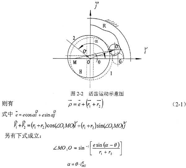 (圖2-2) ,波發(fā)生器H勻速逆時(shí)針旋轉(zhuǎn),設(shè)活齒在波發(fā)生器上作純滾動(dòng)并在中心輪齒廓限制下推動(dòng)活齒架作勻速逆時(shí)針轉(zhuǎn)動(dòng)。波發(fā)生器H 的幾何中心為O′,活齒G 的幾何中心為O1。在矢量ΔO O′O1中,矢量
