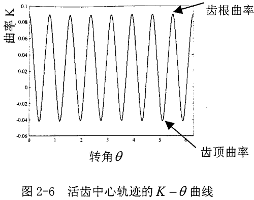 (1)由圖2-6中K-θ曲線可以看出,中心輪每一個(gè)齒在齒根處曲率最大,曲率半徑最小。沿著齒廓上升的過(guò)程中曲率減小到零后,繼續(xù)減小為負(fù)值。到達(dá)齒頂時(shí),曲率最小。