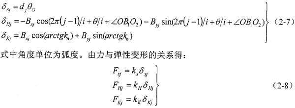 考慮變形協(xié)調(diào)條件,設(shè)第j個(gè)活齒的接觸變形量分別為δHj,δKj和δSj,導(dǎo)致活齒中心與旋轉(zhuǎn)中心O的連線OB1轉(zhuǎn)過(guò)微小角度θG,反映在坐標(biāo)系中,就是活齒中心B在水平和垂直兩方向微小的位移Bxj和Byj,可列: