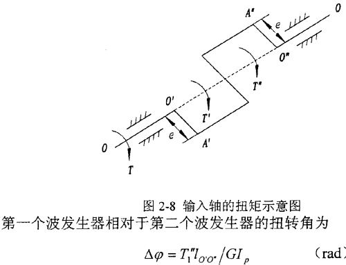 在實(shí)際應(yīng)用中,為平衡掉負(fù)載對(duì)支承的徑向作用,一般采用180°對(duì)稱布置的雙排結(jié)構(gòu),兩排活齒共用一個(gè)活齒架。圖2-8 中O′a′、O″A″分別表示第一排、第二排波發(fā)生器的偏心距。在以下分析中約定:上角標(biāo)“′”表示第一排活齒傳動(dòng)的參數(shù),上角標(biāo)“″”表示第二排活齒傳動(dòng)的參數(shù)。T1、T1′和T1″分別表示輸入軸上的總輸入力矩、第一和第二個(gè)波發(fā)生器分擔(dān)的輸入力矩。在輸入力矩的作用下,輸入軸和波發(fā)生器發(fā)生扭轉(zhuǎn)變形使兩波發(fā)生器的相位差由理論的180°有了一個(gè)相對(duì)的變化△φ,從而使兩排活齒的受力情況略有不同,所承擔(dān)的扭矩也不同。為此,引入載荷傳遞不均勻系數(shù)Kp,設(shè)第二排活齒傳遞的扭矩為KpT2,則第一排活齒傳遞扭矩為(l-KP)T2,其中T2為輸出軸上輸出的總扭矩。
