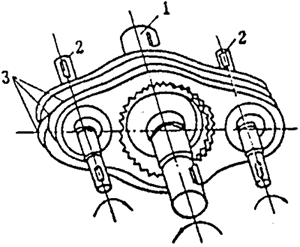 三環(huán)減速器是一種利用三相并列雙曲柄機構來克服死點的連桿內齒行星齒輪減速器,其基本結構如圖5-0所示。它由低速輸出軸1 ,兩根高速輸入軸2 ,三片傳動齒板3組成,各軸均平行配置,相同的兩根高速軸帶動三片傳動齒板呈120°相位差作平面轉動,傳動環(huán)板上的內齒圈與低速軸上的外齒輪相嚙合,形成大速比,其傳動比