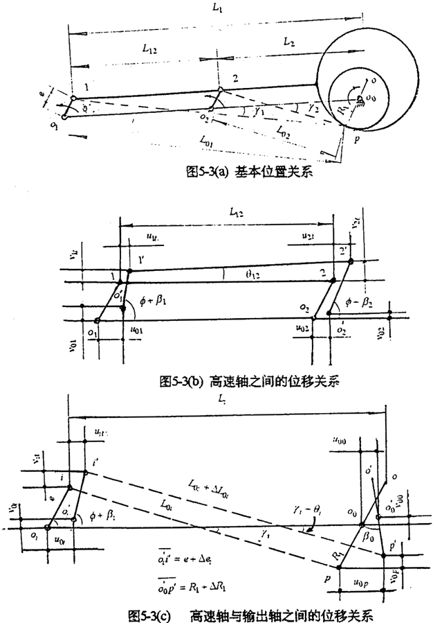 三環(huán)減速是多相并列連桿行星齒輪傳動過約束機構。應該從整體系統(tǒng)上去考慮其變形關系。圖5-3是一相子機構的位移關系圖。圖5-3(a)是基本位置圖、圖5-3(b)是高速軸之間的位移關系、圖5-3(c)是高速軸與輸出軸之間的位移關系(i=1、2)。由圖寫出各運動副中心的位移關系如下: