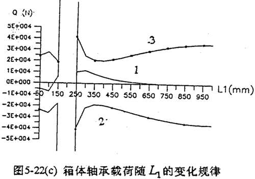 當(dāng)|L1-L2|≤50mm時(shí),載荷產(chǎn)生沖擊為無(wú)窮大,L1≥400mm以后,隨著L1的增加,三相行星軸承載荷幅值變化很緩慢,接近于直線(xiàn)分布。但箱體軸承載荷的幅值在L1>350mm后,隨L1增加各相之間的幅值差變大,趨于不均衡狀態(tài)(見(jiàn)圖5-22c)。因此SHQ50型及SHQ63型的三環(huán)減速器的振動(dòng)比SHQ40型的大。