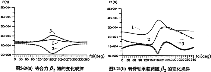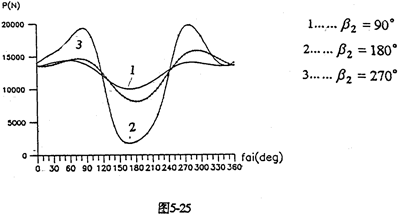 當(dāng)輸入軸與軸出軸的中心距確定后,可通過(guò)調(diào)整支承軸的位置,滿(mǎn)足特殊的空間位置要求,或者設(shè)計(jì)成載荷分布特性最優(yōu)、幅值最小的減速器。圖5-24是中心距L1=400mm、L2=200mm時(shí),支承軸相對(duì)于輸出軸轉(zhuǎn)動(dòng)的角位移β2變化時(shí)嚙合力及行星軸承載荷的分布情況。由圖看出,各種載荷均在180°附近(SHQ偏置式減速器)取得極大值。在0°~90°和270°~360°范圍(Ⅰ、Ⅳ限內(nèi)),三相齒板嚙合力分配很均衡,嚙合沖擊很小。因此。設(shè)計(jì)三環(huán)減速器時(shí),為減小載荷的幅值和各相之間載荷的差值、支承軸應(yīng)盡可能遠(yuǎn)離180°,即不采用三軸心共線(xiàn)的水平位置的結(jié)構(gòu)。圖5-25為幾個(gè)特殊位置的嚙合力隨轉(zhuǎn)角變化的分布規(guī)律。