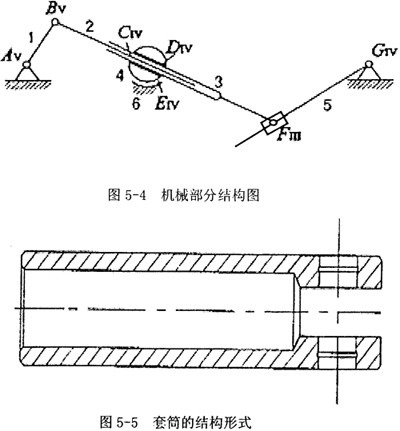 首先將原來(lái)的原理圖轉(zhuǎn)換成以下的機(jī)構(gòu)結(jié)構(gòu)圖(僅部分轉(zhuǎn)換),如圖5-4,即原來(lái)2、3構(gòu)件之間是滑塊和連桿連接,現(xiàn)改為連桿、套筒改為加一個(gè)擺動(dòng)軸結(jié)構(gòu),原來(lái)滑塊3和地面連接,容易形成過(guò)約束,改為加一個(gè)擺動(dòng)軸承4來(lái)和地面、套筒來(lái)連接。擺動(dòng)軸承內(nèi)芯相當(dāng)于一個(gè)球副,其轉(zhuǎn)動(dòng)中心必為內(nèi)芯的球心,當(dāng)然也是整個(gè)擺動(dòng)軸承的中心。這樣便于加工查和實(shí)驗(yàn)實(shí)施,而且更重要的是可防止原來(lái)原理圖中桿件連接出形成過(guò)約束。