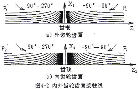 由(4-1-10)式和式(4-1-12)式通過(guò)計(jì)算,可以得到內(nèi)外齒輪齒面上接觸線坐標(biāo),由計(jì)算出的坐標(biāo)值即可繪出接觸線圖形。