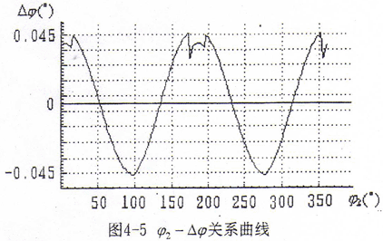 (2)以一對(duì)齒在一轉(zhuǎn)中始終嚙合為例計(jì)算分析可知,△φ的變化除在純翻轉(zhuǎn)區(qū)稍有波動(dòng)外,總體約呈余弦規(guī)律變化,如圖4-5所示,這說(shuō)明運(yùn)動(dòng)是非勻速的。當(dāng)理論嚙合齒對(duì)在△φ為零的點(diǎn)嚙合時(shí),與其相鄰的齒對(duì)若要嚙合,它的△φ值約為10-5弧度數(shù)量級(jí);