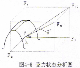 在接觸點(diǎn)K處,受力狀態(tài)如圖4-6所示。作用在外齒輪輪齒K點(diǎn)的總作用力為Fn,F(xiàn)n可分解為切向力Ft,徑向力Fr和軸向力Fa。由圖4-6知
