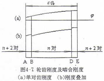 嚙合過(guò)程中,n對(duì)齒與n+2對(duì)齒交替嚙合,剛度疊加,如圖4-7(b)所示。由嚙合剛度的定義知