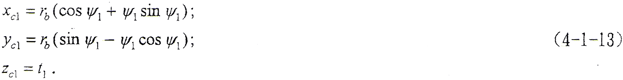 設(shè)中截面齒廓為漸開(kāi)線,xc1坐標(biāo)軸線通過(guò)漸開(kāi)線在基圓上的起點(diǎn),(o,xc1,yc1,zc1)坐標(biāo)下的齒面方程為