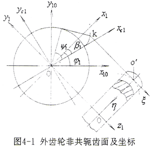 外齒輪齒面及坐標(biāo)系如圖4-1所示。此處只討論在平行于端面的各截面上,為不同變位系數(shù)的漸開(kāi)線外齒輪。