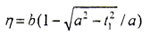 △的計(jì)算如下,設(shè)鼓形齒鼓度曲線為一橢圓,參數(shù)為長(zhǎng)半軸a,短半軸b,當(dāng)a=b時(shí)為圓弧。在鼓度曲線上建立局部坐標(biāo)系(o′,ξ,η),o′為齒寬中線與分度圓線交點(diǎn),ξ與z1方向相同,η為指向齒輪軸線的方向。在此坐標(biāo)系上橢圓方程為