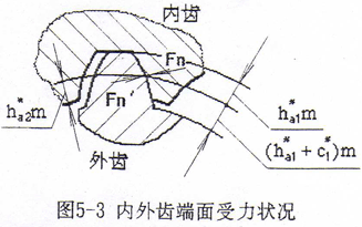 一般鼓形齒聯(lián)軸器的齒頂高系數(shù)ha1*=1,徑向間隙系數(shù)c1*=0.25,全齒高h(yuǎn)=2.25m,采用標(biāo)準(zhǔn)齒輪,其內(nèi)外齒輪分度圓齒厚大致相等。它的主要優(yōu)點(diǎn)是內(nèi)外齒輪加工工藝性好,可采用標(biāo)準(zhǔn)齒輪滾刀和插齒刀進(jìn)行加工,且尺寸計(jì)算簡(jiǎn)單。但是這種鼓形齒聯(lián)軸器的外齒輪齒根抗彎強(qiáng)度比內(nèi)齒輪齒根抗彎強(qiáng)度要低,即內(nèi)齒輪齒根彎曲強(qiáng)度有富余。因此,可設(shè)法增加外齒輪齒厚,提高外齒輪齒根彎曲強(qiáng)度。通常采用兩種方法:一是采用特殊刀具減簿內(nèi)齒輪齒厚而增加外齒輪齒厚,使內(nèi)外齒輪的抗彎強(qiáng)度接近一致;另一種方法是采用變位短厚齒型內(nèi)外齒輪,降低外齒輪齒高,加大外齒輪齒厚,使其粗短,以提高外齒輪的抗彎強(qiáng)度[75]。前一種方法需采用專用的瘦齒型滾刀,這給加工帶來不少麻煩,因此在國(guó)內(nèi)不宜推廣。文獻(xiàn)[75]所出了一種變位短厚齒型鼓形齒聯(lián)軸器的設(shè)計(jì)制造方法,由于是采用標(biāo)準(zhǔn)滾刀和插齒刀進(jìn)行加工,加工方法簡(jiǎn)單易行,因此工藝性好,生產(chǎn)效率高,是一種較理想的適宜推廣應(yīng)用的設(shè)計(jì)加工方法。但是,該文提出采用齒頂高系數(shù)ha1*=0.8不一定合理,因?yàn)辇X頂高系數(shù)的確定一方面要使內(nèi)外齒輪齒根彎曲強(qiáng)度一致,另一方面又要使內(nèi)外齒輪齒面具有足夠的接觸強(qiáng)度及內(nèi)齒輪齒頂厚應(yīng)大于0.25m。因此必須建立優(yōu)化數(shù)學(xué)模型進(jìn)行計(jì)算來確定。將內(nèi)外齒輪輪齒簡(jiǎn)化成懸臂梁受力(如圖5-3所示)[127],本問題是要使內(nèi)外齒輪齒根有接近的齒根彎曲強(qiáng)度,則目標(biāo)函數(shù)為