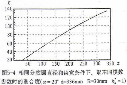 鼓形齒聯(lián)軸器的齒數(shù)模數(shù)決定了其徑向結(jié)構(gòu)尺寸大小。對(duì)于優(yōu)化鼓度曲線的鼓形齒聯(lián)軸器,其嚙合特性與共軛齒面鼓形齒聯(lián)軸器相近,因此我們可以依據(jù)共軛齒面鼓形齒聯(lián)軸器特性來考慮齒數(shù)模數(shù)的參數(shù)優(yōu)化問題。圖5-4給出了相同齒輪分度圓直徑和齒寬條件下取不同模數(shù)齒數(shù)時(shí)的重合度曲線,從曲線可以看出相同齒輪分度圓直徑和齒寬條件下,所取齒數(shù)越多,則重合度越大。重合度越大,平均每對(duì)齒承受的載荷越小,多齒嚙合過渡狀態(tài)載荷分配的變化量越小,傳動(dòng)越平穩(wěn)。因此總的模數(shù)齒數(shù)的選取原則是盡可能選大的齒數(shù)。但是相同齒輪分度圓直徑條件下,齒數(shù)越大,模數(shù)越小。模數(shù)的減小將降低齒根彎曲強(qiáng)度;另外,由齒面接觸線形態(tài)知,模數(shù)的減小也將降低齒面接觸強(qiáng)度。為保證有足夠的齒根彎曲強(qiáng)度和齒面接觸強(qiáng)度,應(yīng)由所傳遞的轉(zhuǎn)矩和許用應(yīng)力值,先計(jì)算出所允許的最小模數(shù),再根據(jù)這個(gè)模數(shù)值及分度圓直徑來確定齒數(shù)。由于使用中磨損是不可避免的,因此,選取模數(shù)時(shí)還應(yīng)考慮輪齒齒厚有一定的裕量,保證在一定的磨損程度下仍有足夠的強(qiáng)度。另外,模數(shù)的選取還應(yīng)考慮工藝條件的許可。這些內(nèi)容包含較多的經(jīng)驗(yàn)成份,在此不予詳細(xì)討論。
