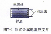 金屬電阻應(yīng)變片有絲式應(yīng)變片和箔式應(yīng)變片等不同形式。本實(shí)驗(yàn)采用絲式應(yīng)變片,其結(jié)構(gòu)如圖7-1所示。它是用一根金屬細(xì)絲按圖示形狀彎曲后用膠粘劑貼于用紙或有機(jī)聚合物薄膜等材料制成的襯底上,電阻絲兩端焊有引出線。