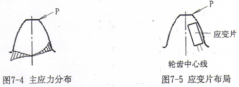 鼓形齒聯(lián)軸器內(nèi)外齒輪的嚙合齒對(duì)承受所作用的轉(zhuǎn)矩的作用。一般情況下,內(nèi)齒輪輪齒的剛度大于外齒輪輪齒的剛度[33][34][37],為了能更有效地反應(yīng)應(yīng)變,工作應(yīng)變片貼于外齒輪輪齒的端面,溫度補(bǔ)償應(yīng)變片貼于不受力的相同材料上。輪齒的應(yīng)力狀態(tài)較復(fù)雜,在齒根處還存在應(yīng)力集中。但總的來(lái)說(shuō),對(duì)于一個(gè)齒,其齒根主應(yīng)力分布[118]如圖7-4所示,因此考慮工作應(yīng)變片貼于輪齒中心線受拉應(yīng)力的一側(cè),靠近齒根b邊緣處。這樣既不影響齒的嚙合,又能有效地反應(yīng)接觸狀況,貼片布局見(jiàn)圖7-5所示。由于輪齒端面位置較為狹小,無(wú)法貼兩片應(yīng)變片,因此采用單臂工作方式測(cè)試。
