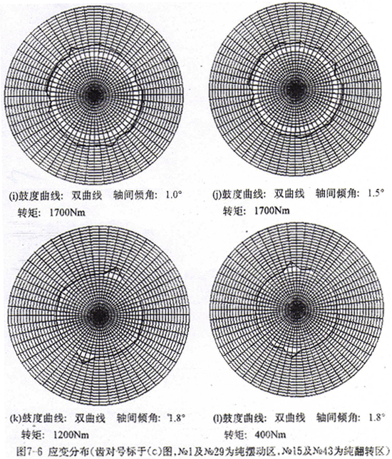 2.在有軸間傾角存在的情況下,應(yīng)變的分布以純翻轉(zhuǎn)區(qū)為最大,純擺動(dòng)區(qū)最小,約呈橢圓分布,這一方面是由于理論接觸點(diǎn)在純翻轉(zhuǎn)區(qū),另一方面是由于偏載的影響;