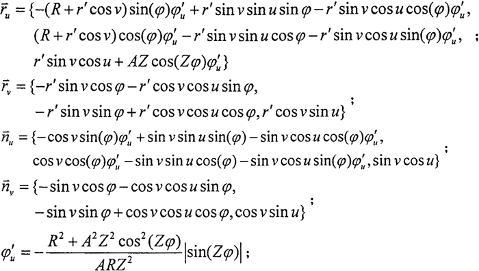 在進(jìn)行圓柱正弦活齒傳動(dòng)接觸強(qiáng)度分析時(shí),需要利用正弦滾道齒面的主曲盆和主曲率半徑,為此需對(duì)正弦滾道齒面的主曲率和主曲率半徑進(jìn)行分析計(jì)算。根據(jù)微分幾何理論,除在曲面上的奇異點(diǎn)之外,法曲率隨著所選取的方向下同而變化,而在一個(gè)非奇異的固定點(diǎn),沿不同方向的法曲率之中有其最大值和最小值,而這最大值法曲率和最小值法曲率及分別稱為曲面在該點(diǎn)的兩個(gè)主曲率,當(dāng)主曲率不為零時(shí),主曲率的倒數(shù)稱為主曲率半徑;對(duì)應(yīng)主曲率的方向稱為主方向,并且兩個(gè)主方向互相垂直。