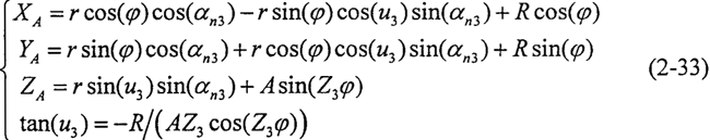 應(yīng)平行于活齒中心的速度方向矢量{0,-tan(u3),1},據(jù)此條件,可以得到α=αn3-π/2。則旋轉(zhuǎn)軸的方向矢量為: