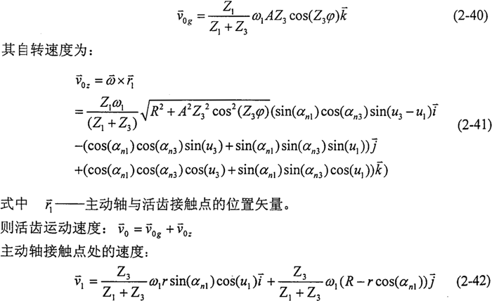 根據(jù)空間解析幾何中兩空間直線夾角的公式,由式(2-34)、(2-36)可求出兩軌跡曲線LA、LO切線的夾角αAO,通過(guò)計(jì)算證明αAO小于10°,忽略αAO引起的活齒相對(duì)殼體滾道齒面的滑移運(yùn)動(dòng)。同理可以求得兩軌跡曲線LB、LO切線的夾角αBO,計(jì)算證明αBO較大,故不可忽略由αBO引起的活齒相對(duì)于主動(dòng)軸滾道齒面的滑移運(yùn)動(dòng)。若將活齒中心O看作活齒運(yùn)動(dòng)的瞬時(shí)中心,則活齒在與殼體齒面接觸點(diǎn)A的速度方向即為活齒在該點(diǎn)繞其自身軸線旋轉(zhuǎn)的速度方向,活齒自轉(zhuǎn)的旋轉(zhuǎn)軸線應(yīng)在垂直與該速度方向的平面上,也就是在殼體正弦滾道的法截面上。設(shè)旋轉(zhuǎn)軸,即活齒自轉(zhuǎn)角速度的方向矢量為: