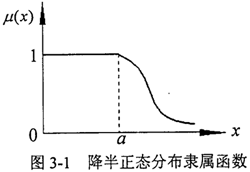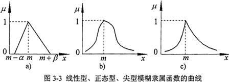 線性型參照函數(shù)在“完全屬于”和“完全不屬于”之間的中介狀態(tài)是線性變化的(圖3-3a),當(dāng)x≤m-α和x≥m+β時(shí),μ=0,說明在(m-α,m+β)區(qū)間之外的數(shù)值完全不屬于該模數(shù)數(shù)。而其他兩種類型的隸屬函數(shù)曲線兩端延伸至無窮遠(yuǎn)(圖3-3b,c)說明整個(gè)數(shù)軸上的任何數(shù)總在一定程度上隸屬于該模糊數(shù)。在選擇參照函數(shù)時(shí),除非有絕對(duì)的把握認(rèn)為該事件發(fā)生的概率在某個(gè)范圍之內(nèi)而選擇線性參照函數(shù),否則,以選取正態(tài)型或尖型為好。