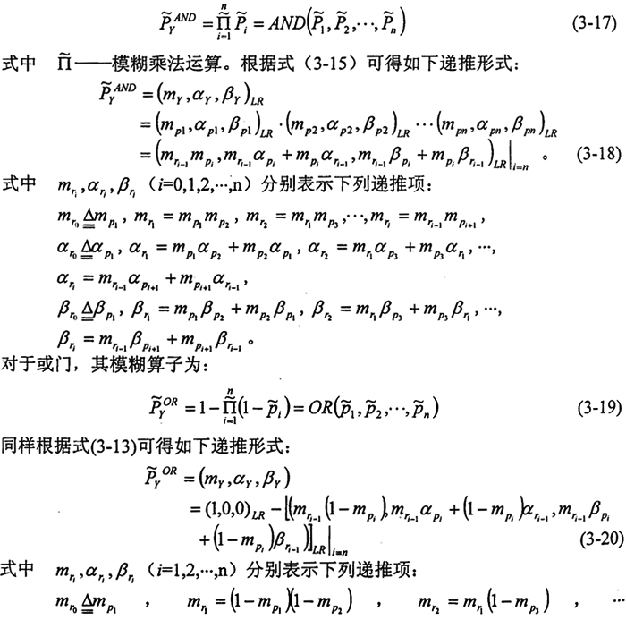 3.3.3.1模糊分析的理論基礎(chǔ) 在故障樹的模糊分析中,采用模糊數(shù)來描述事件發(fā)蘭的概率。模糊數(shù)是由概念上的模糊性或各種模糊因素的影響而造成定量處理時(shí)的不確定性。以模糊數(shù)描述概率值,帶有人的主觀性,強(qiáng)調(diào)了人在系統(tǒng)可靠性分析與評(píng)價(jià)中的重要性。因此,故障樹的模糊分析不僅可減少獲取事件發(fā)生概率精確值的難度,而且能結(jié)合工程中的實(shí)際經(jīng)驗(yàn)和判斷構(gòu)造模糊數(shù)為隸屬函數(shù),較準(zhǔn)確地把它們描述出來,并在一定程度上允許存在描述誤差,具有較大的靈活性和適應(yīng)性。