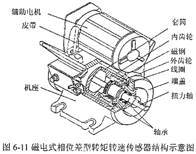 圖6-11為磁電式相位差型轉(zhuǎn)矩轉(zhuǎn)速傳感器的結(jié)構(gòu)示意圖,它由機(jī)座、端蓋、扭力軸、內(nèi)齒輪、外齒輪、磁鋼、線圈軸承等組成。內(nèi)齒輪、磁鋼固定在套筒上,線圈固定在端蓋上,外齒輪固定在扭力軸上,當(dāng)內(nèi)外齒輪發(fā)生相對轉(zhuǎn)動時,由于磁通不斷變化,在線圈中便感應(yīng)出近似正弦波的感應(yīng)電勢ul、u2,兩感應(yīng)電勢的初始相位差是恒定的,考慮到正反加載,φ0設(shè)計在大約180°位置上,當(dāng)加上扭力時,扭力軸發(fā)生扭轉(zhuǎn)變形,在彈性范圍內(nèi)外加扭矩與機(jī)械扭轉(zhuǎn)角成正比,這時ul、u2訊號的相位差要發(fā)生變化,即