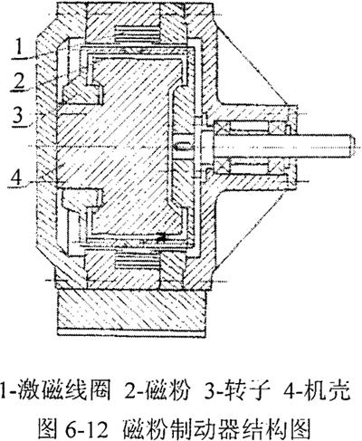 采用磁粉制動器作為試驗的加載裝置。磁粉制動器由轉(zhuǎn)子、機(jī)殼、激磁線圈、磁粉組成,其結(jié)構(gòu)如圖6-12所示。在激磁線圈不通電流時,不產(chǎn)生磁通,磁粉呈自由狀態(tài)。當(dāng)軸轉(zhuǎn)動時,由于離心力的作用,使磁粉散布在轉(zhuǎn)動件與機(jī)殼之間,若此時激磁線圈通電流,則在線圈周圍產(chǎn)生磁場,轉(zhuǎn)動件與機(jī)殼間的磁粉沿磁通方向連接成鏈狀,由于磁粉間的結(jié)合力,使工作面之間產(chǎn)生摩擦力,從而形成制動力矩,起到加載的作用。該力矩與激磁電流的大小基本成正比,故通過調(diào)節(jié)激磁線圈的電流大小可在一定范圍內(nèi)改變制動力矩的大小。