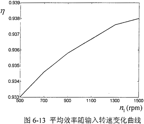 進(jìn)行減速器效率試驗前,首先讓減速器在輸入轉(zhuǎn)速為500rpm的條件下,空載跑合4個小時,觀察運(yùn)轉(zhuǎn)正常后,進(jìn)入試驗的準(zhǔn)備階段。為測得準(zhǔn)確試驗數(shù)據(jù)必項對轉(zhuǎn)矩轉(zhuǎn)速測量儀進(jìn)行常數(shù)輸入和轉(zhuǎn)矩調(diào)零設(shè)置,一切準(zhǔn)備完畢后,開始對減速器進(jìn)行試驗測試。當(dāng)輸入軸轉(zhuǎn)速取不同值時計算出減速器樣機(jī)的傳動比及樣機(jī)總評傳動比如表6-1所示,通過分析測試數(shù)據(jù)可知,經(jīng)實測最大的傳動比誤差為-0.0148,平均傳動比誤差為-0.0078。表明樣機(jī)的傳動比準(zhǔn)確,傳動精度高。經(jīng)分析可知,正弦滾道的加工精度是造成整機(jī)傳動誤差的主要原因。