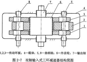 完全平衡雙軸輸入式三環(huán)式減速器如圖2-7所示。其工作原理為:三環(huán)式減速器的曲柄軸在動力的驅(qū)動下同步旋轉(zhuǎn),傳動環(huán)板上的內(nèi)齒圈與輸出軸上的外齒輪相互嚙合,形成了大傳動比,從而實現(xiàn)了減速及動力傳遞。雙軸同步輸入可以克服傳動機構(gòu)的死點問題。
