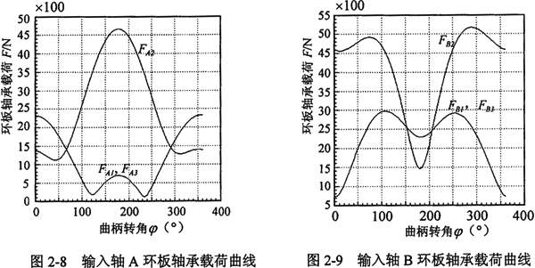 由環(huán)板軸承的受力曲線可看出,兩輸入軸環(huán)板軸承受力是不同的,其最大值也略有差別。