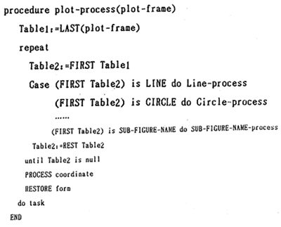 計(jì)算機(jī)各種語言以及各種繪圖軟件包各具風(fēng)格,繪圖指令各種各樣,但萬變不離其宗。因而就有可能形成一種通用的機(jī)制。作者在這里研制了一種較通用的繪圖指令生成器,其原理是通過分析各種繪圖軟件包的各種繪圖指令,在盡可能廣泛的情況下,使繪圖指令生成器的內(nèi)部,包含各種繪圖指令。同時(shí),繪圖指令生成器也可以通過編輯或輸入的方法進(jìn)一步擴(kuò)充繪圖指令?梢酝ㄟ^二種方式改變輸出繪圖文件的格式:一是通過編輯修改輸出語句格式;二是通過教導(dǎo)式的學(xué)習(xí)方法改變繪圖文件的物出格式,如下過程: