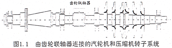 以往在對(duì)軸承一轉(zhuǎn)子系統(tǒng)進(jìn)行動(dòng)力學(xué)分析的過(guò)程中,對(duì)于構(gòu)成系統(tǒng)的一些典型部件,如轉(zhuǎn)子、支承軸承、密封以及基礎(chǔ)都作過(guò)較深入的研究,但對(duì)于聯(lián)軸器耦合效應(yīng)的討論卻不多。直觀地講,多跨轉(zhuǎn)子正是依賴多個(gè)聯(lián)軸器才得以構(gòu)成大型系統(tǒng)的,因此更確切地講對(duì)于大型的多跨(或分跨)轉(zhuǎn)子系統(tǒng)可以稱為軸承—轉(zhuǎn)子—聯(lián)軸器系統(tǒng)。以大型的汽輪發(fā)電機(jī)組和壓縮機(jī)組為例,汽輪發(fā)電機(jī)組在低壓轉(zhuǎn)子、發(fā)電機(jī)轉(zhuǎn)子以及勵(lì)磁機(jī)轉(zhuǎn)子間均采用了剛性或半撓性聯(lián)軸器結(jié)構(gòu);對(duì)于壓縮機(jī)組,在壓縮機(jī)轉(zhuǎn)子和驅(qū)動(dòng)設(shè)備如驅(qū)動(dòng)汽輪機(jī)轉(zhuǎn)子或電機(jī)轉(zhuǎn)子之間也要采用不同形式的聯(lián)軸器。圖1.1所示是一透平壓縮機(jī)組的簡(jiǎn)圖,為一典型的軸承—轉(zhuǎn)子—齒輪聯(lián)軸器系統(tǒng),整體系統(tǒng)由一個(gè)CL型的齒輪聯(lián)軸器將汽輪機(jī)轉(zhuǎn)了和壓縮機(jī)主軸連接組成。