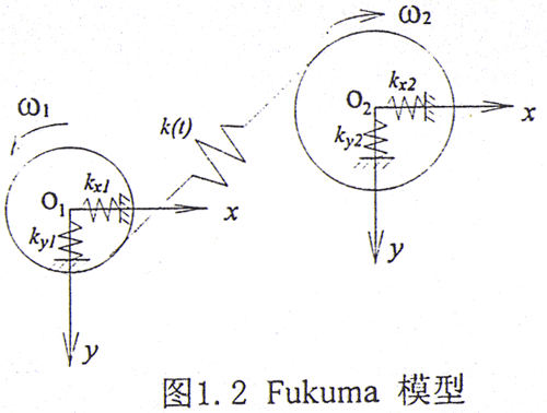 齒輪是機(jī)械系統(tǒng)中一個(gè)非常重要的部件,主要用于傳遞轉(zhuǎn)子之間的運(yùn)動(dòng)。對(duì)于外齒輪耦合轉(zhuǎn)子軸承系統(tǒng)的研究已經(jīng)進(jìn)行了數(shù)十年[14],比較典型的模型有Fukuma[15]、IWATSUBO[16]、Kahraman[17]模型和彎扭耦合模型[18],其中[15,18]中的模型分別如圖1.2和圖1.3所示。這些模型的共同特點(diǎn)是將嚙合的輪齒看成能夠產(chǎn)生變形的彈簧,同時(shí)考慮了齒輪中心的橫向位移和繞中心轉(zhuǎn)動(dòng)的扭轉(zhuǎn)角位移,這樣對(duì)一個(gè)外齒輪而方Fukuma[15]模型就具有三個(gè)自由度,一對(duì)嚙合的外齒輪共有六個(gè)自由度;而彎扭耦合模型[18]則考慮了齒輪之間的嚙合關(guān)系,這一關(guān)系相當(dāng)與給系統(tǒng)增加了一個(gè)約束,使得系統(tǒng)的自由度減少了一個(gè),因此是一個(gè)五自由度模型。