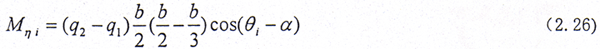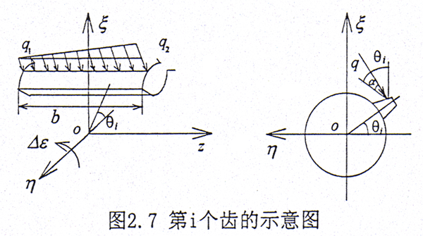 在外載荷較大時(shí),則齒輪聯(lián)軸器內(nèi)外齒面之間接觸良好。設(shè)齒面上的載荷是線性分布,其集度分別為q1、q2,如圖2.7所示。在繞η方向給一小轉(zhuǎn)角△δ,則在第i個(gè)齒對產(chǎn)生的扭矩為Mηi。b是穩(wěn)態(tài)時(shí)內(nèi)外齒之間的有效接觸齒寬。