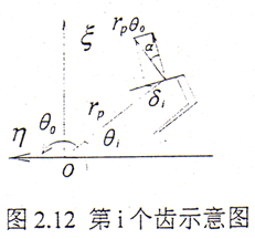 設(shè)內(nèi)、外齒輪軸線間有一相對橫向振幅δ0,如圖2.10所示,則第i對齒面相對滑動(dòng)的位移為δi=δ0/cosα,齒面滑動(dòng)摩擦力為Ff=fT/rpncosα,其中f為齒面間的滑動(dòng)摩擦系數(shù),第i對齒對上的摩擦力消耗的能量為Ei=4Ffδi