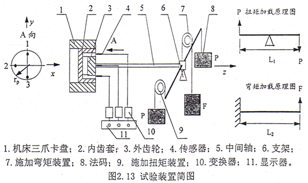 齒輪聯(lián)軸器的內(nèi)齒套固定在一個(gè)三爪卡盤上,聯(lián)軸器的外齒輪插入內(nèi)齒套與之相嚙合。采用3個(gè)電渦流傳感器,傳感器的布置見圖2.13,試驗(yàn)臺(tái)的實(shí)拍照片見圖2.14。中間軸的一端與外齒輪固接,而另一端則用于施加扭矩和施加繞X方向的彎矩。扭矩和彎矩的大小由法碼的重量和桿或軸的長度來確定。作用于聯(lián)軸器上的扭矩