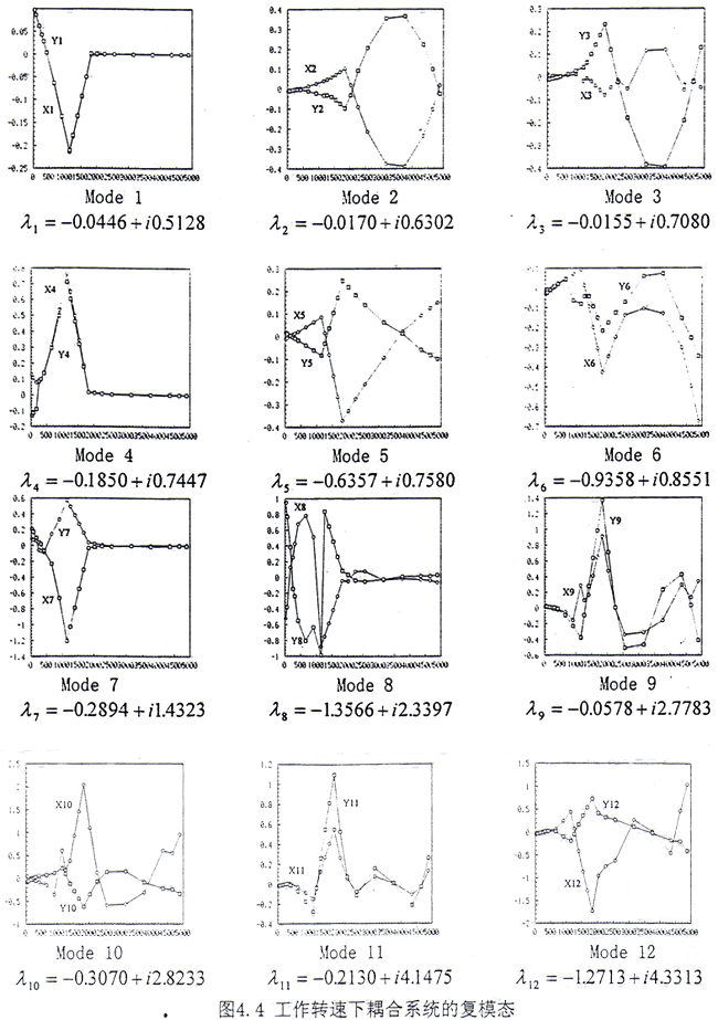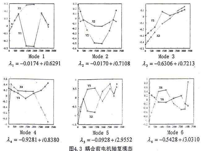 通過齒輪聯(lián)軸器耦合后的轉(zhuǎn)子系統(tǒng),在上述給定的轉(zhuǎn)速范圍內(nèi),共為12階模態(tài),如圖4.4所示,比耦合前多了2階。這表明耦合后在上述轉(zhuǎn)速范圍內(nèi)模態(tài)數(shù)目發(fā)生了變化。耦合系統(tǒng)的模態(tài)可以分為兩類:(1)第一類為耦合成分很小的振動(dòng),例如Mode1、Mode4、Mode7、Mode8,這4階幾乎完全表現(xiàn)為G軸的振動(dòng),電機(jī)軸的振動(dòng)很小。但是從模態(tài)圖上來看又不能與耦合前單個(gè)G軸的4階模態(tài)相對(duì)應(yīng),主要表現(xiàn)為與齒輪聯(lián)軸器相連接的G軸的外伸端在耦合前上述4階的振動(dòng)很大,而在耦合后振動(dòng)受到很大的抑制,振動(dòng)很小。從復(fù)特征值來看,無論是反應(yīng)系統(tǒng)衰減快慢的實(shí)部,還是反映系統(tǒng)自然振動(dòng)頻率的虛部都有不小的變化。如果將上述4階對(duì)應(yīng)的復(fù)特征值作一比較,那么其中耦合后的虛部值總是大于耦合前的對(duì)應(yīng)值。其主要原因是在耦合后將G軸和電機(jī)軸作為一個(gè)整體系統(tǒng)來考慮,此時(shí)相當(dāng)于將電機(jī)軸看作是對(duì)G的一個(gè)約束,這一約束直接作用于外伸端,使得G軸外伸端的振動(dòng)減小,同時(shí)使得G軸的自然頻率增大。因此傳統(tǒng)上在計(jì)算DH機(jī)組的動(dòng)態(tài)特性時(shí),強(qiáng)行將G軸和電機(jī)軸分開,而只考慮其中的G軸,僅從這4階模態(tài)和復(fù)特征值上進(jìn)行分析也會(huì)產(chǎn)生較大的偏差。(2)第二類為G軸和電機(jī)軸之間的耦合模態(tài),在這8階模態(tài)中G軸和電機(jī)軸的振動(dòng)非常明顯,這表明如果將G軸和電機(jī)軸在齒輪聯(lián)軸器處分開處理,僅計(jì)算G軸的振動(dòng),而不考慮電機(jī)軸的影響,那么上述8階模態(tài)會(huì)全部被漏掉,因此這樣處理會(huì)丟失一些非常重要的低頻信息。在文獻(xiàn)[18]中,由于未考慮電機(jī)軸的作用,因此與電機(jī)軸有關(guān)的模態(tài)信息就不出現(xiàn)。如果從這8階復(fù)特征值前6階的數(shù)值來看,那么都能從耦合前電機(jī)軸的6階模態(tài)中找到,而且低階特征值的實(shí)部和虛部變化均不大。這說明如果僅分析電機(jī)軸的振動(dòng),那么將G軸忽略掉,倒能得到較好的近似。從直觀上看,將G軸與電機(jī)軸相比,其質(zhì)量和幾何參數(shù)要小許多。如果將G軸看成是電機(jī)軸的約束,那么這一約束比電機(jī)軸對(duì)G軸的約束自然要弱得多。因此從這一意義上來說G軸對(duì)電機(jī)軸的影響沒有電機(jī)軸對(duì)G軸的影響大。綜上所述,耦合后電機(jī)軸對(duì)G軸的影響較大,而G軸對(duì)電機(jī)軸的影響較小。在實(shí)際工程中,象DH這樣的機(jī)組曾發(fā)生電機(jī)振動(dòng)過大的現(xiàn)象[9],因此如果不將G軸、電機(jī)軸和齒輪聯(lián)軸器作為整體一起進(jìn)行分析而在齒輪聯(lián)軸器處強(qiáng)行分開只分析G軸的振動(dòng)就顯得極不合適。