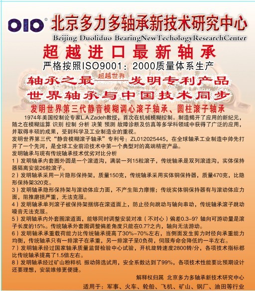 高端軸承新技術(shù)專(zhuān)利簡(jiǎn)介    高端軸承新技術(shù)發(fā)明專(zhuān)利簡(jiǎn)介:本廠發(fā)明了高端滾動(dòng)調(diào)心滾子軸承(三類(lèi)), 高端園柱滾子(二類(lèi)),在承重方面保持了傳統(tǒng)軸承的各種優(yōu)點(diǎn),承截能力加強(qiáng)了,不同之處在于它沒(méi)有傳統(tǒng)的保持架,同時(shí)沒(méi)有了
