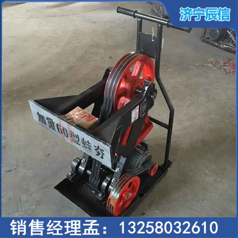 蛙式夯實機利用旋轉慣性力的原理制成,由夯錘、夯架、偏心塊、皮帶輪和電動機等組成。電動機及傳動部分裝在橇座上,夯架后端與傳動軸鉸接,在偏心塊離心力作用下,夯架可繞此軸上下擺動。夯架前端裝有夯錘,當夯架向下方擺動時就夯擊土壤,向上方擺動時使橇座前移。因此,蛙式夯夯錘每沖擊一次,機身即向前移動一步。